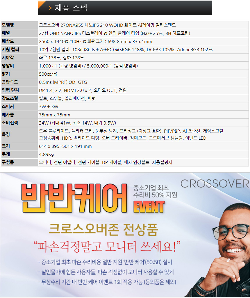 크로스오버 모니터는 5억원 생산물 배상 책임보험에 가입되어 있으며 중소기업 최초로 수리비 50%를 지원하는 반반케어 이벤트를 진행하고 있어 안심하고 사용할 수 있다. (무상수리 기간내 파손이 발생했을 때 수리비용의 절반을 지원한다.)