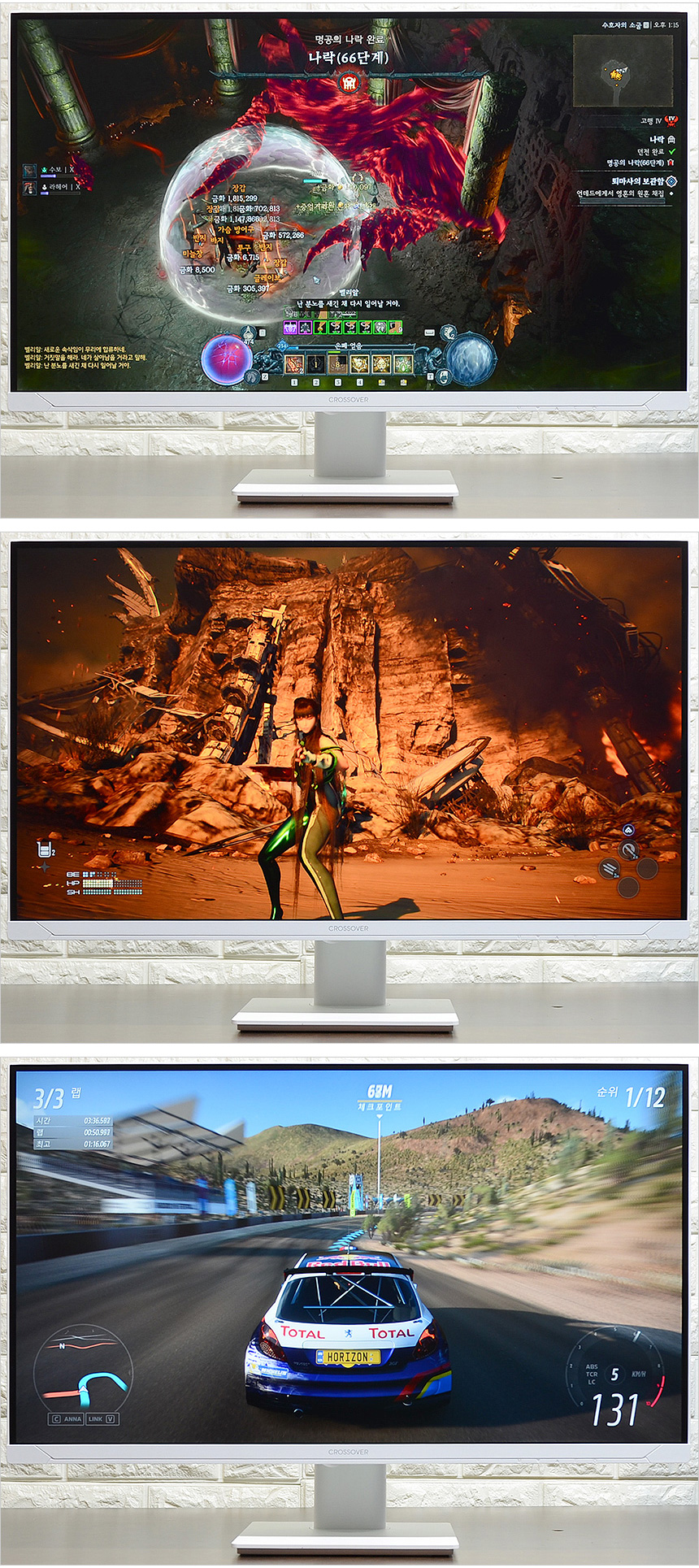 디아블로 4 와 스텔라 블레이드, 포르자 호라이즌 5 를 플레이 하고 있는 모습으로 높은 밝기로 시인성이 상당히 뛰어났으며 (특히 디아블로 4를 플레이 할 때 확연한 구분감을 제공했다.) 나노IPS 패널 모니터 답게 밝고 화사한 영상을 즐길 수 있었다. 또한 0.5ms 에 불과한 빠른 응답속도로 잔상없는 부드러운 영상을 즐길 수 있었다. 화면의 전환이 상당히 빠른 레이싱 게임도 만족스럽게 즐길 수 있을 것이다.