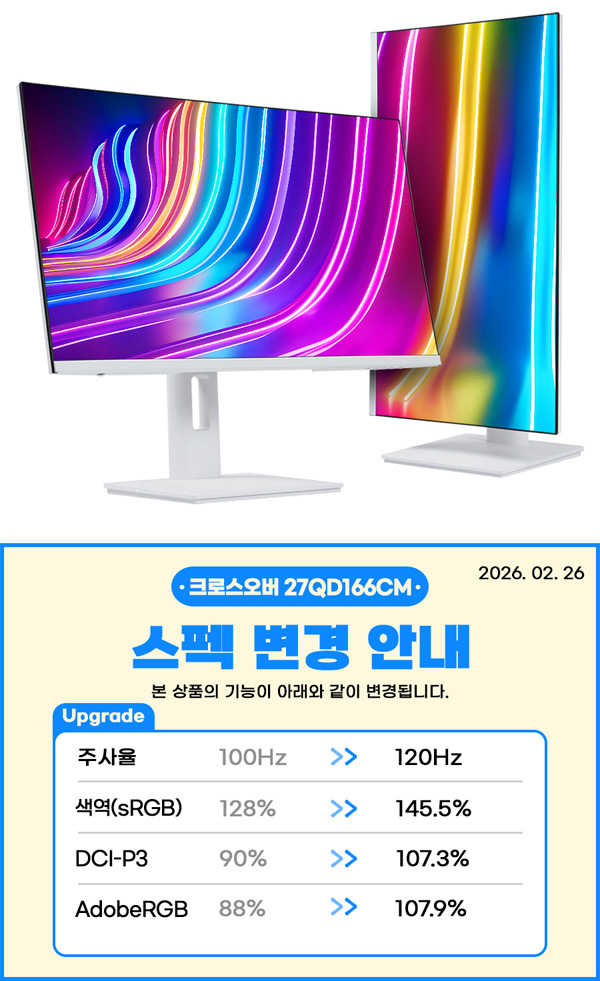 크로스오버가 27형 QHD 고해상도에 고주사율을 지원하는 ‘크로스오버 27QD166CM QHD iPS USB-C 화이트 Ai 멀티스탠드’ 모델에 대해 업그레이드를 실시했다고 밝혔다.