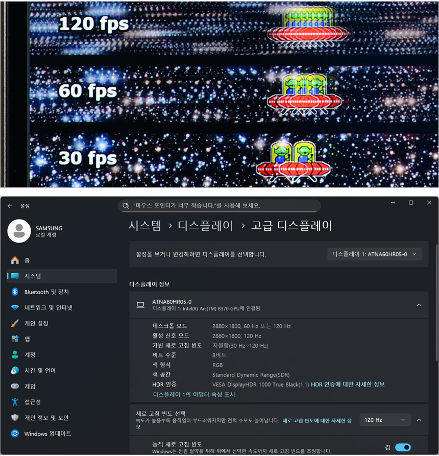 120Hz 주사율 지원으로 부드러운 영상을 즐길 수 있으며 영상에 맞게 주사율을 조정하는 가변주사율을 적용해 불필요한 배터리 소모를 최소화 했다. (가변 주사율 설정 뿐만 아니라 60Hz & 120Hz 고정도 가능하다.) 상단의 사진은 120Hz 주사율을 쉽게 인지할 수 있도록 하위 프레임과 같이 재생되는 영상 (960 Pixel Per Sec) 을 셔터스피드 1/20 로 촬영한 모습으로 프레임이 낮을수록 캐릭터의 수가 적으며 프레임이 높아질수록 시간당 많은 화면이 뿌려지기 때문에 캐릭터의 수가 많은 것을 확인할 수 있다. (가변 주사율이 30Hz 까지 낮아진 것이 눈에띈다. 정적인 화면에서 더 배터리를 절약하기 위한 셋팅이다.)