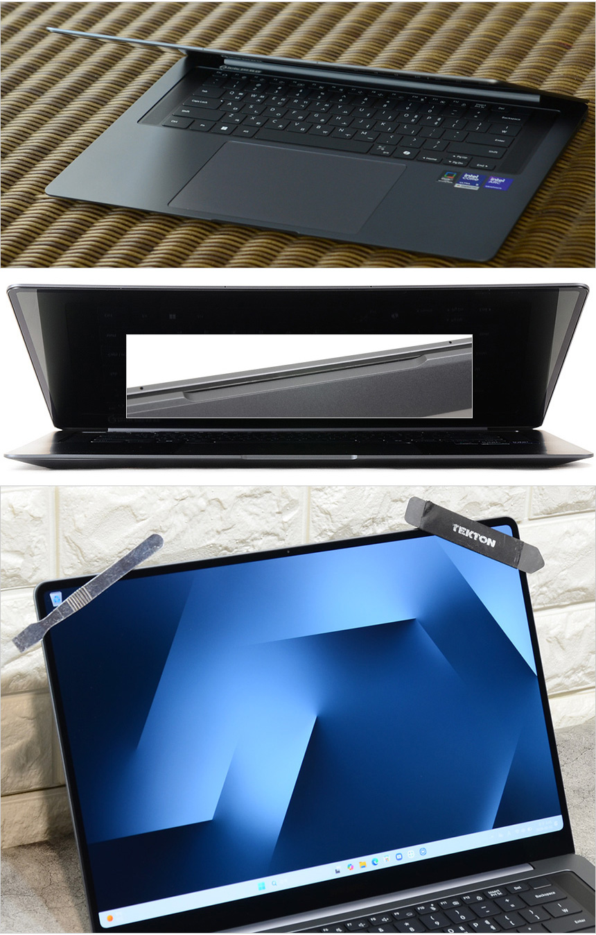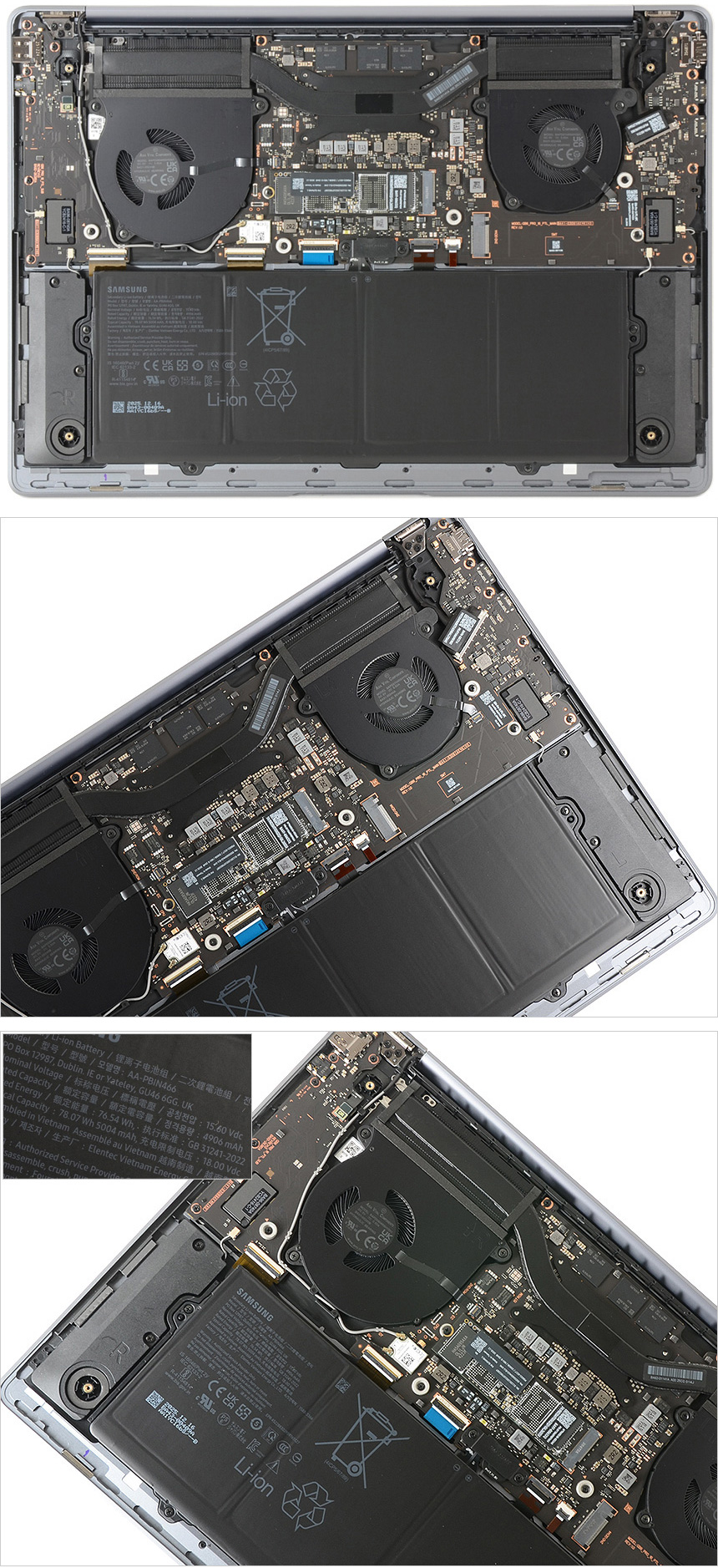 노트북 내부의 모습으로 상단에 듀얼팬과 방열판 등이 설치된 것을 확인할 수 있으며 하단에는 78.07Wh (5004mAh) 리튬이온 배터리가 설치되어 있고 마그네틱과 스피커가 장착된 것도 알 수 있다. 32GB LPDDR5X 메모리가 장착되어 있고 PCIe 4.0 기반의 256GB NVMe SSD 등이 설치되어 빠른 데이터 전송속도를 경험할 수 있으며 여분의 M.2 슬롯 지원으로 여유롭게 데이터를 저장할 수 있다. 뿐만 아니라 인텔 Wi-Fi 7 무선랜을 지원해 고속 무선속도를 즐길 수 있으며 블루투스 무선연결이 가능하다.