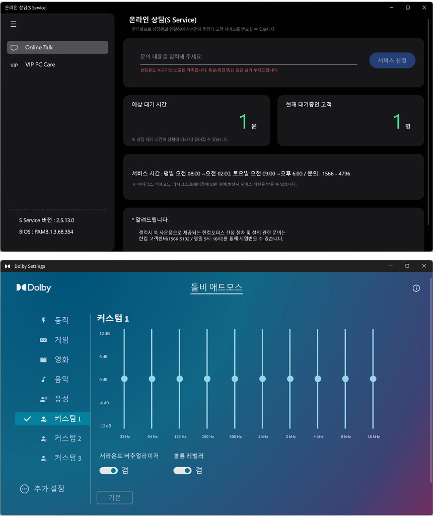 노트북에 문제가 생겼을 때 온라인 상담을 통해 손쉽게 문제를 해결할 수 있으며 돌비 애트모스 지원으로 사용자에 맞는 최적의 음색을 설정할 수 있다.