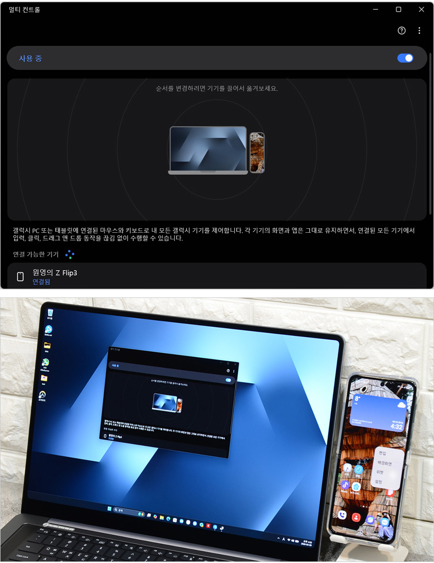 노트북 키보드와 연결된 마우스를 스마트폰에서도 사용할 수 있는 멀티 컨트롤 기능을 제공한다. 상단의 사진은 멀티 컨트롤을 테스트 하고 있는 모습으로 듀얼 모니터를 사용한 듯 자연스럽게 마우스 커서가 이동하는 것을 확인할 수 있었다. (KVM 과 달리 디바이스 변경을 위한 단축키도 누를 필요가 없다.) 텍스트 등을 복사에 기기간 붙여넣기도 할 수 있어 유용하게 활용할 수 있을 것이다. @ 동영상을 확인하기 바란다.