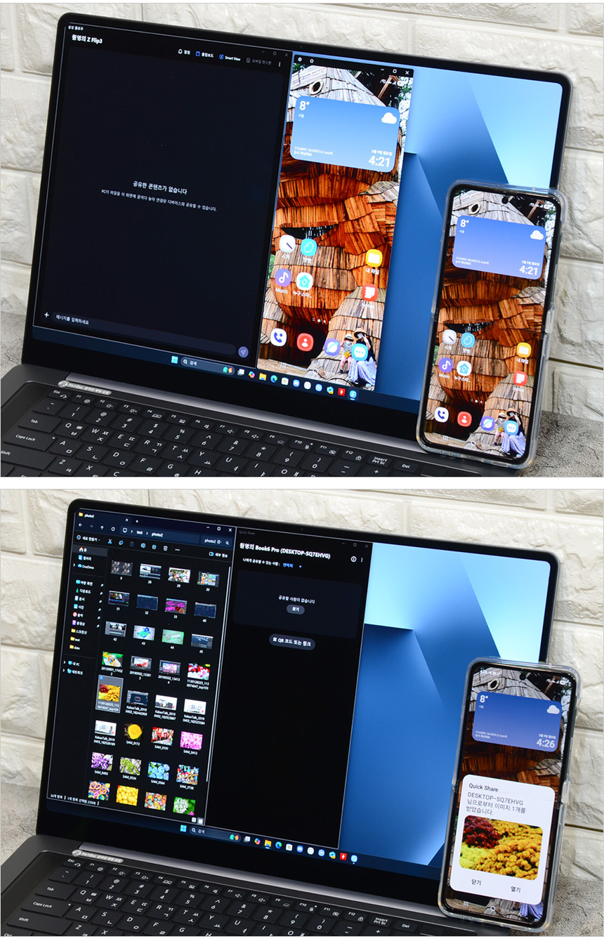 삼성 플로우를 사용하면 노트북에서 스마트폰을 컨트롤 할 수 있으며 무선으로 스마트폰과 간단하게 사진이나 영상, 파일을 전송할 수 있는 Quick Share를 지원해 유용하게 활용할 수 있다. 뿐만 아니라 태블릿과 연결해 화면을 공유할 수 있는 Second Screen을 통해 작업 효율성을 높일 수 있다.