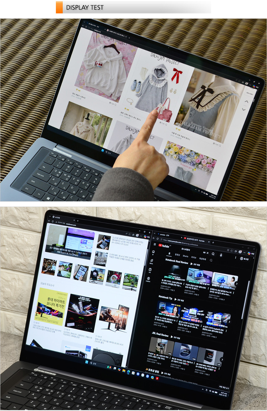 16:9 비율의 일반 노트북과 달리 더 넓은 작업 공간을 제공해 생산성을 극대화 하는 16:10 비율 디스플레이를 지원한다. 세로의 길이가 길어 웹서핑시 편하게 글을 읽을 수 있으며 문서작업이나 포토샵과 같은 디자인 작업의 효율성을 높일 수 있다. (16:9 비율 노트북 대비 세로의 길이가 약 11% 정도 길다.) 또한 터치를 적용해 마우스를 사용하기 힘든 외부에서도 마우스 수준의 빠른 노트북 조작이 가능하며 테스트 부분에서 설명드릴 AI 셀렉트를 편하게 활용할 수 있다. 또한 선명도를 높이기 위해 글레어 타입을 사용 했음에도 반사율을 최대 75% 감소시키는 코닝 고릴라 글라스 with DXC를 적용해 자연광이 비추는 야외에서도 선명한 영상을 즐길 수 있다.