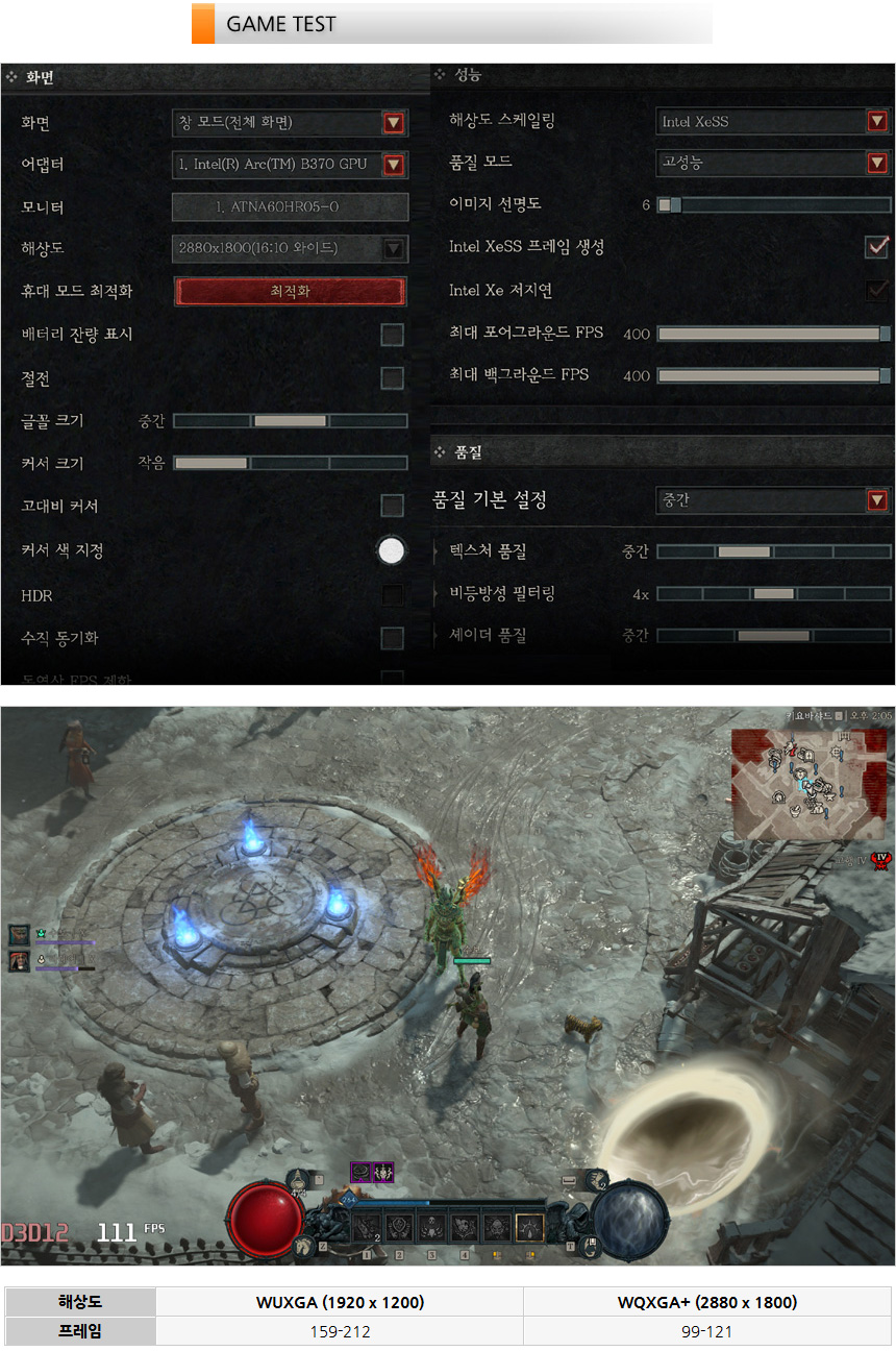 디아블로 4를 이용해 게임 테스트를 진행하고 있는 모습으로 WUXGA 해상도에서만 테스트 했던 기존 내장그래픽 노트북과 달리 기본 해상도인 WQXGA+ 에서도 게임을 실행해 보았다. 디아블로4는 XeSS 프레임 생성이 가능해 게이밍 노트북 수준의 프레임으로 게임을 즐길 수 있었다. (기존의 슬림 노트북과는 비교되지 않을 정도로 스코어가 높아졌다.)