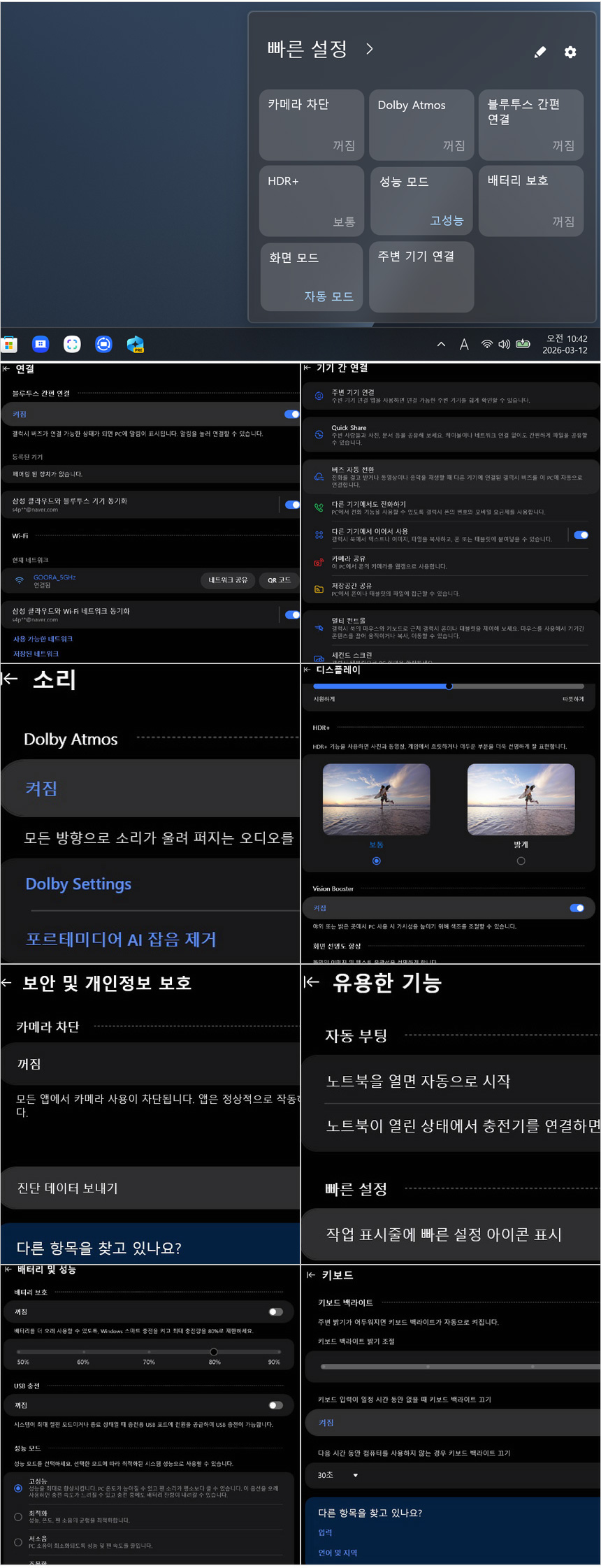 Samsung Settings의 실행 모습으로 빠른 설정을 지원해 편의성을 높였으며 연결과 사운드 & 디스플레이 설정이 가능하고 퍼포먼스 설정과 자동부팅, USB 충전, 키보드 백라이트 설정 등을 지원한다. 또한 보안관련 설정에서 카메라 비활성화가 가능해 사생활 침해등을 미연에 방지할 수 있다.