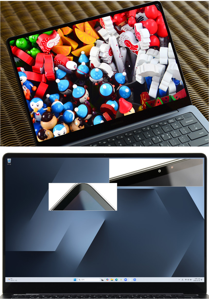 다이나믹 AMOLED 2X 디스플레이를 탑재한 노트북으로 시야각 없는 선명한 영상을 즐길 수 있다. 상단의 사진은 시야각 테스트를 진행하고 있는 모습으로 극단적인 각도에서도 진하고 선명한 색감을 보여주었다.