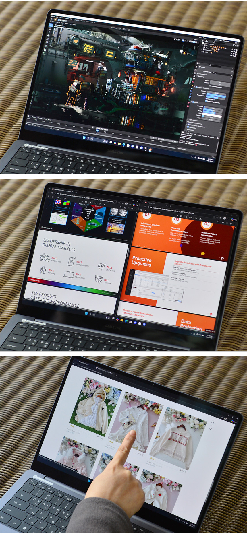 고화질 동영상을 이용해 멀티미디어 테스트를 진행하고 있는 모습으로 슬림베젤 적용으로 AMOLED 특유의 선명함이 돋보였으며 슬림 베젤이 설치되어 탁 트인 시야감을 경험할 수 있었다. 특히 일반 노트북과 확연히 비교되는 입체감 넘치는 사운드가 더해져 만족스럽게 영상을 즐길 수 있었다.