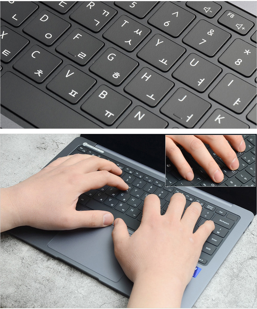키보드 타이핑 테스트를 진행하고 있는 모습으로 14형 모델이지만 16:10 디스플레이 노트북 답게 팜래스트의 면적이 넓어 손을 편하게 올려두고 타이핑 할 수 있었으며 (장시간 타이핑시에도 손의 피로감이 크지 않았다.) 넓은 키간격과 낮은 키압으로 피로감 없이 고속 타이핑을 할 수 있었다. 키압은 낮은편이며 구분감은 비교적 확연해 손가락의 부담없이 고속 타이핑이 가능했다.