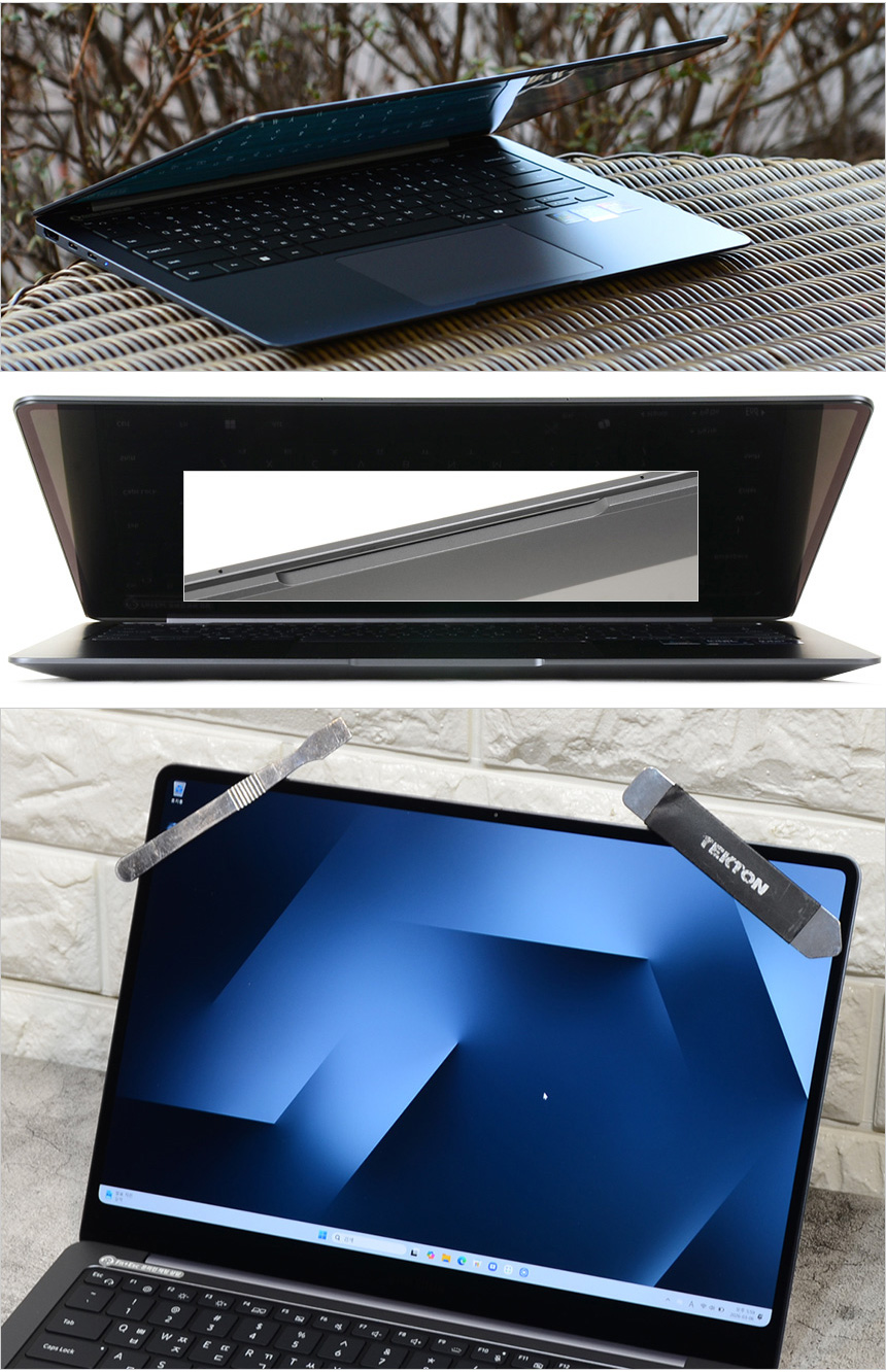메인보드에 16GB LPDDR5X 메모리가 장착되어 있으며 중앙에는 PCIe 4.0 기반의 256GB NVMe SSD 등이 설치되어 빠른 데이터 전송이 가능하다. 또한 인텔의 최고급형 무선랜카드 Wi-Fi 7 BE211이 설치되어 초고속 무선랜과 블루투스 무선연결이 가능하다. @ 바닥면 분리 난이도 중 : 사방에 설치된 고무패드를 분리한 후 내부에 있는 볼트를 풀어준다. 이후 헤라를 이용해 힌지 부분을 공략해 틈을 만들면 (지렛대의 원리를 이용하면 된다.) 바닥면 분리가 가능하다. 기본적인 방법은 간단하지만 바닥면이 빡빡하게 고정되어 있고 휘어질 위험이 커 조심해야 한다.