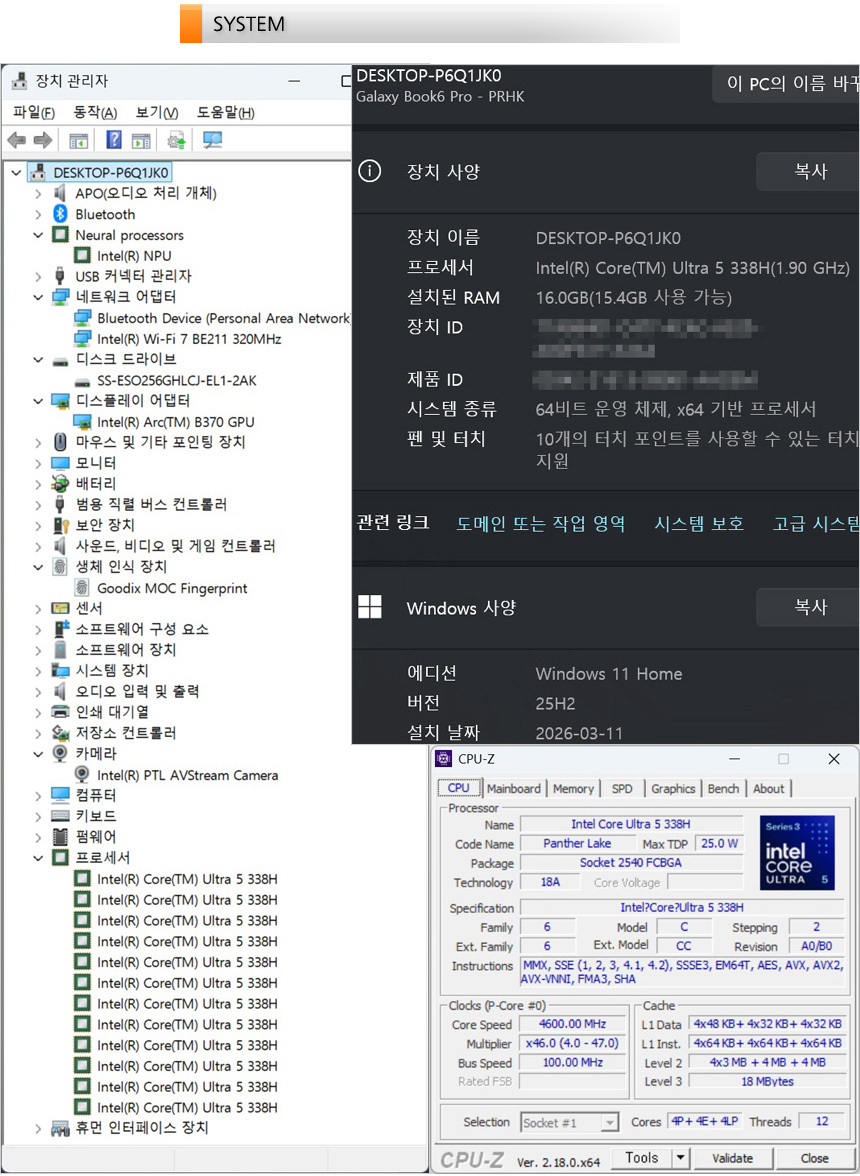 노트북의 정보를 자세히 확인하고 있는 모습으로 4P+4E+4LP 코어에 20MB+18MB 캐시를 지원하는 인텔코어 울트라 5 338H 프로세서가 탑재된 것을 확인할 수 있다. 인텔 18A 공정으로 설계된 팬서레이크 프로세서로 기존 모바일 프로세서와는 확연히 비교되는 강력한 성능을 경험할 수 있다.