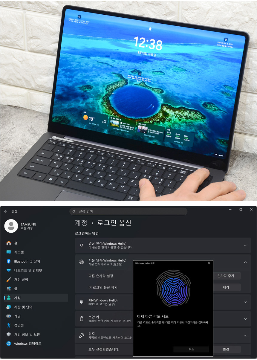 사용편의성을 높이기 위해 키보드 1열에 다양한 펑션키를 제공하며 우측에는 지문인식 센서를 내장한 전원 버튼이 설치된 것을 확인할 수 있었다. (보안성을 높이기 위해 스마트폰에서 적용되던 삼성 녹스 보안 솔루션도 적용되어 있다.) 별도로 분리된 보안칩을 통해 해킹등으로부터 데이터를 안전하게 보관할 수 있다.