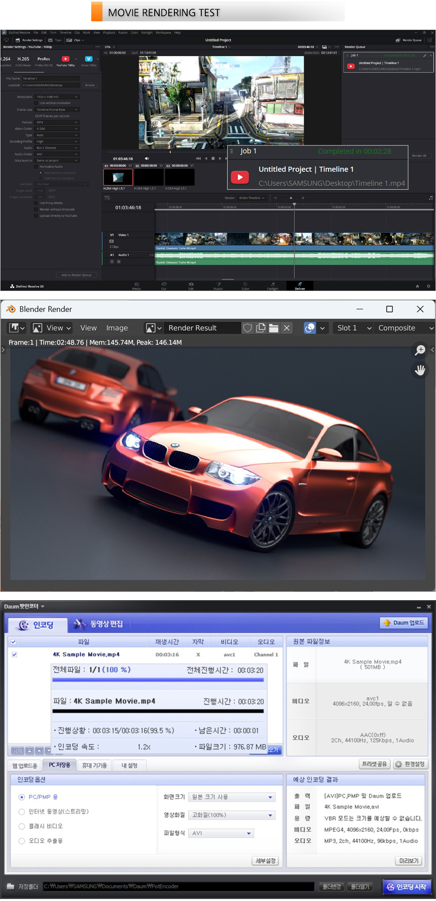 영상편집 S/W 다빈치 리졸브를 이용해 랜더링 테스트를 진행하고 있는 모습으로 (640MB, 920MB, 990MB 4K 동영상을 단일 동영상으로 랜더링, FHD 해상도에 H.264 비디오 코덱) 2분 28초가 소요되는 것을 확인할 수 있었으며 블랜더 랜더링 테스트에서는 2분대의 빠른 랜더링 시간을 보여주었다. 또한 다음 팟인코더를 이용해 4K 동영상의 인코딩을 진행했는데 3분 20초의 인코딩 시간을 보여주었다. (크리에이터 노트북으로 손색이 없다.)