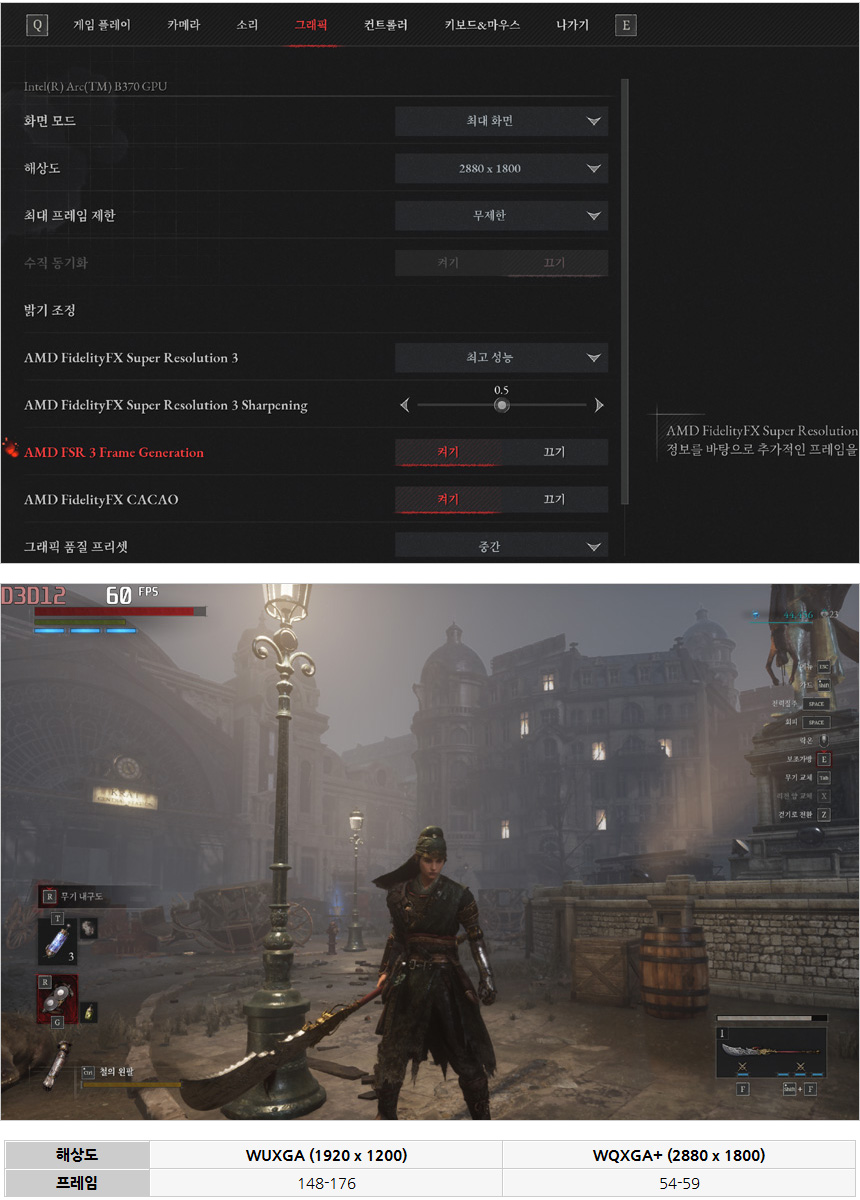 국산게임 P의 거짓을 중간옵션에서 플레이 하고 있는 모습으로 FSR3 프레임 생성을 활성화 하면 (FSR 기술은 AMD 뿐만 아니라 인텔 프로세서 에서도 적용할 수 있다.) 프레임이 대폭 상승해 여유롭게 게임을 즐길 수 있다.