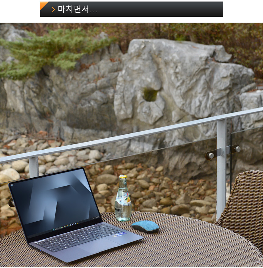 안정성 까지 고려한 설계도 칭찬하고 싶다. 집적도가 높은 작은 크기의 노트북이 고성능으로 작동하면 자연스레 열로 인한 문제가 발생할 수 있는데 이 제품은 성능이 떨어지지 않으면서도 온도제어가 잘 되는 것을 확인할 수 있었다. (물론 16형의 갤럭시북6 프로 보다는 온도가 높다.) 업그레이드된 쿨링 기술을 적용해 팬소음도 줄인 모델로 편하게 사용할 수 있을 것이다.