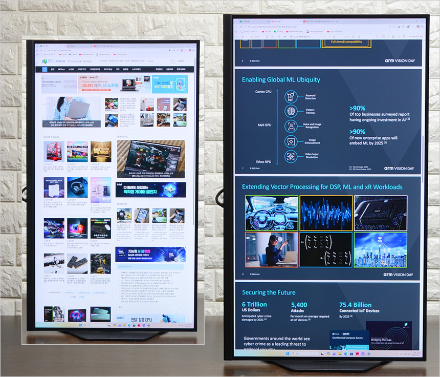 멀티스탠드를 지원하는 것도 칭찬하고 싶다. 스마트폰 등에 특화된 세로영상을 꽉찬 화면으로 즐길 수 있으며 문서작업이나 웹서핑이 상당히 편했다. 또한 높낮이 조절과 회전도 가능해 사용자에 맞게 모니터 위치를 조정할 수 있었다.