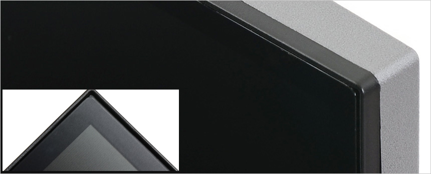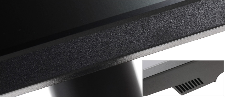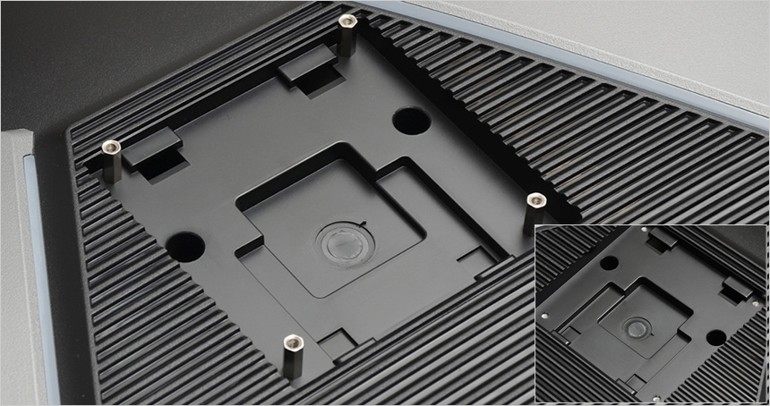 모니터 후면부의 모습으로 직관적인 OSD 컨트롤이 가능한 조그 다이얼이 설치되어 있고 (전원 버튼 기능도 제공하며 LED가 내장되어 야간에도 손쉽게 모니터 상태를 확인할 수 있다.) 도난 방지를 위한 시큐리티 홀도 설치된 것을 확인할 수 있다.