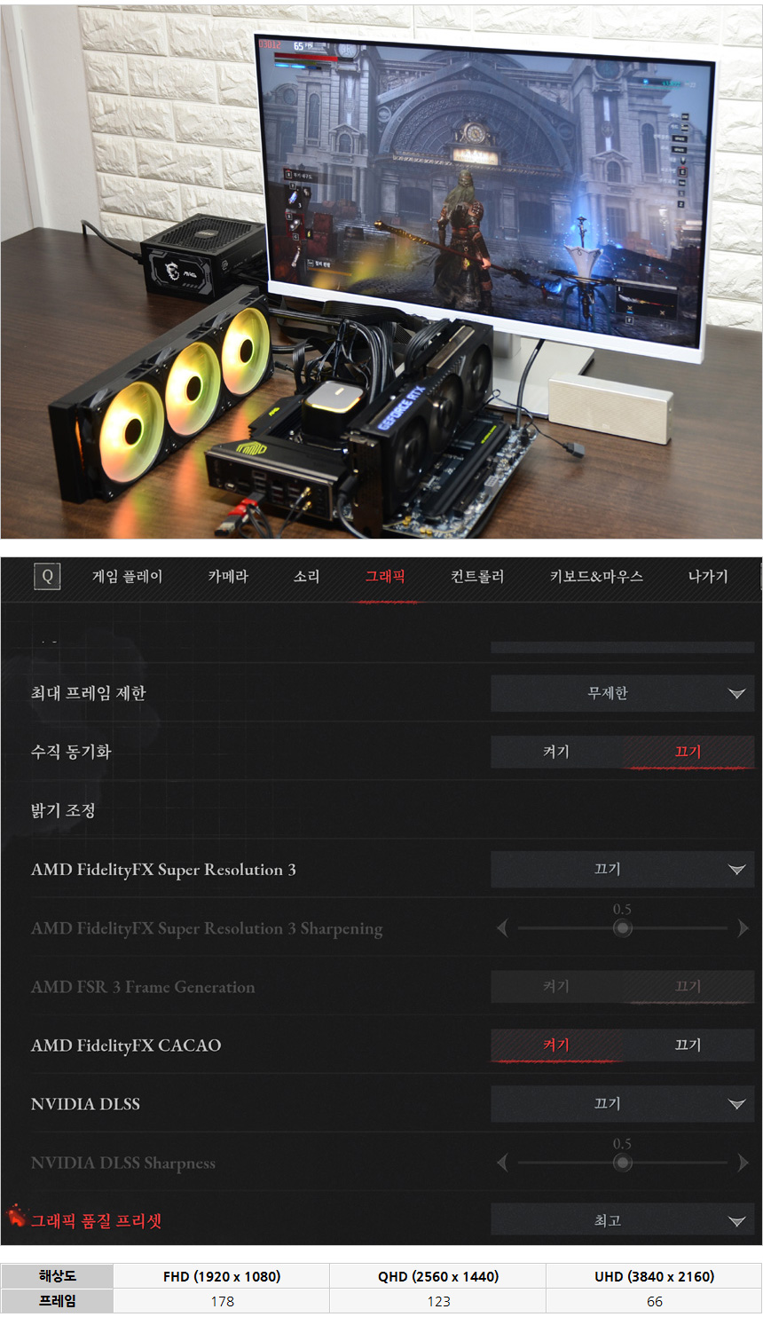디아블로 4를 이용해 프레임 테스트를 진행한 모습으로 (매우높음 옵션, 업스케일링 사용안함) 프레임이 상당히 높은 것을 확인할 수 있었다. 최신 그래픽카드를 사용하고 DLSS나 FSR을 적극 활용하면 더 쾌적하게 최신 게임을 즐길 수 있다.