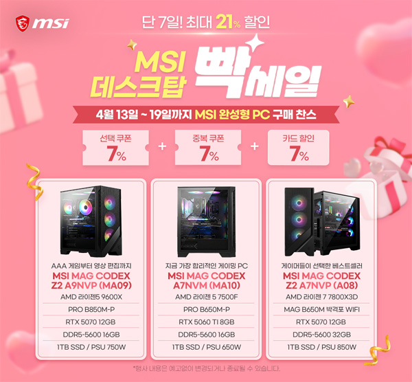 MSI는 4월 13일(월)부터 4월 19일(일)까지 일주일간, G마켓에서 진행하는 가전•디지털기기 대규모 할인 행사 ‘디지털 빡세일’에 참여해 인기 게이밍 데스크탑 ‘코덱스’ 시리즈를 최대 21% 할인된 가격에 선보인다고 밝혔다.