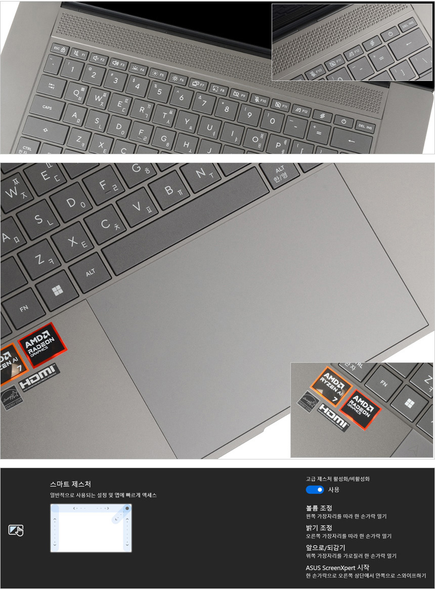 상단에는 안정성을 높이기 위해 통풍구가 설치되어 있고 키보드 1열에는 전원 버튼과 다양한 펑션키를 제공해 편의성을 높였다. 또한 팜래스트 중앙에는 터치패드가 장착되어 마우스를 사용하기 힘든 외부에서도 노트북을 손쉽게 조작할 수 있다. 참고로 터치패드는 스마트 제스처 기능을 지원해 편의성을 높였으며 면적을 넓혀 편하게 조작할 수 있다.