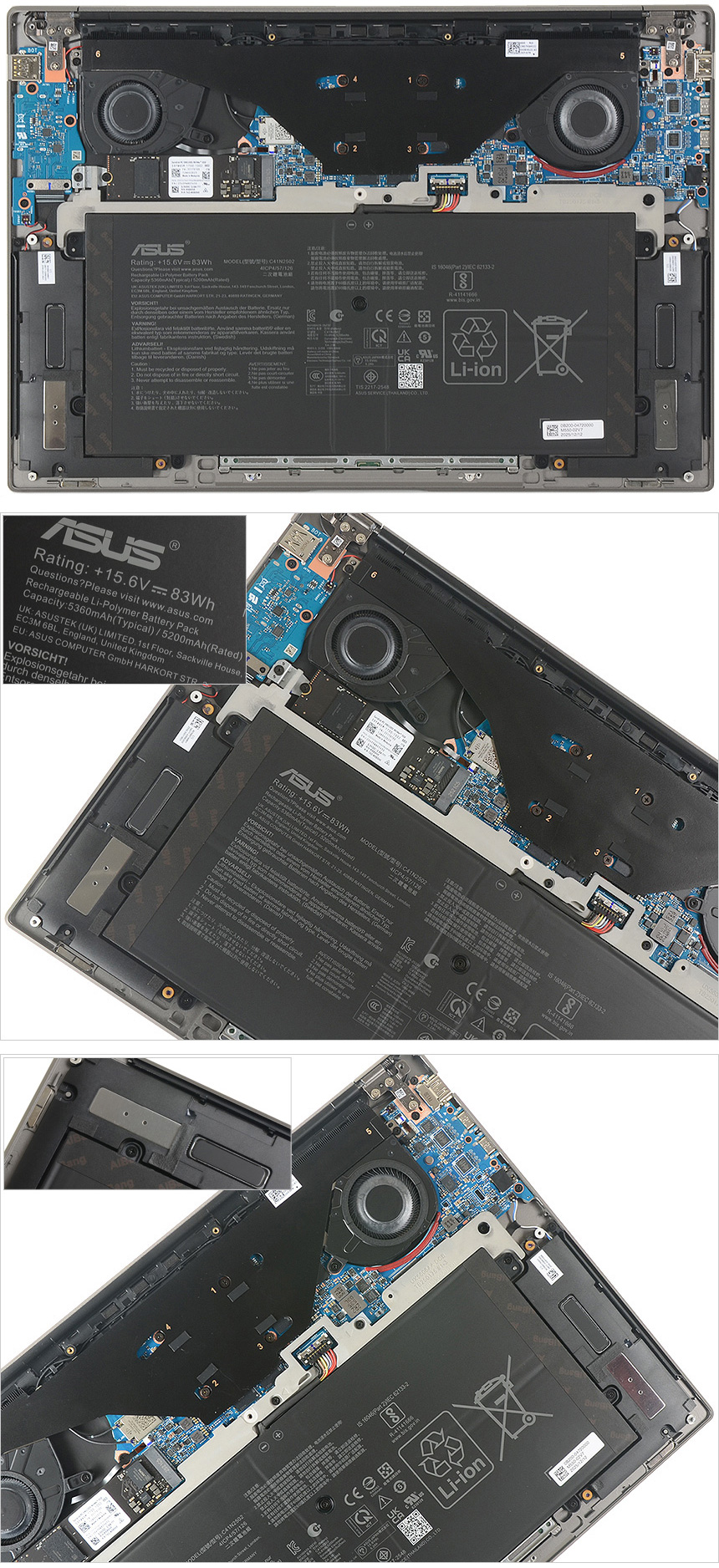 내부의 모습으로 칩셋이 설치된 상단에 듀얼팬과 히트파이프가 설치되어 있고 하단에는 5360mAh 용량의 리튬이온 배터리가 장착된 것을 확인할 수 있다. 또한 하단 양 측면에는 스피커와 무선랜 안테나와 마그네틱이 설치되어 있다.
