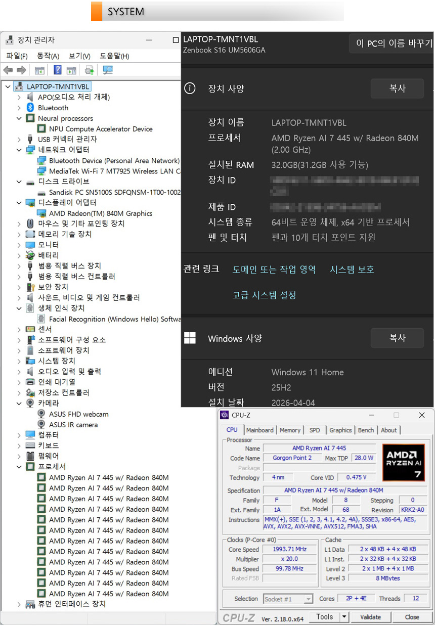 시스템 정보를 확인하고 있는 모습으로 2+4코어에 8MB 캐시가 내장되어 있고 NPU도 지원하는 AMD 라이젠 AI 7 445 프로세서가 장착된 것을 확인할 수 있다. 또한 라데온 840M 내장그래픽을 적용되어 있으며 32GB 넉넉한 메모리 용량을 지원해 대부분의 S/W를 부드럽게 실행할 수 있다.