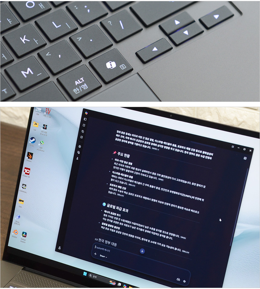 타이핑 테스트를 진행하고 있는 모습으로 16형 대화면 모델답게 팜래스트가 손을 완전히 받쳐주어 손목꺽임 등의 불편없이 노트북을 사용할 수 있었으며 여유로운 키간격으로 오타없는 고속 타이핑이 가능했다. 또한 확연한 구분감과 쫀득쫀득한 키감 제공으로 즐겁게 타이핑 할 수 있었다.