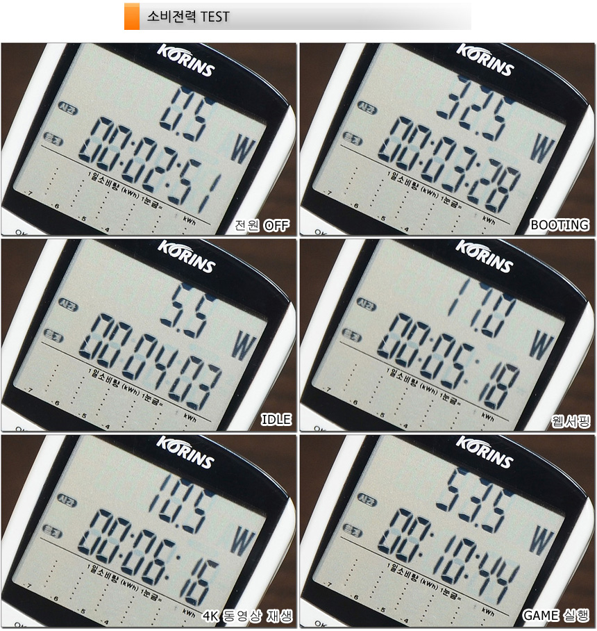 소비전력 테스트를 진행하고 있는 모습으로 (밝기 50%, 최고성능 모드) 캐주얼한 작업에서는 20W 미만의 낮은 소비전력으로 작동했으며 높은 성능을 필요로 하는 게임이나 작업시에는 50W 이상까지 소비전력이 올라가는 것을 확인할 수 있었다. (게임이나 작업시 50W 이상을 꾸준히 유지했다.)