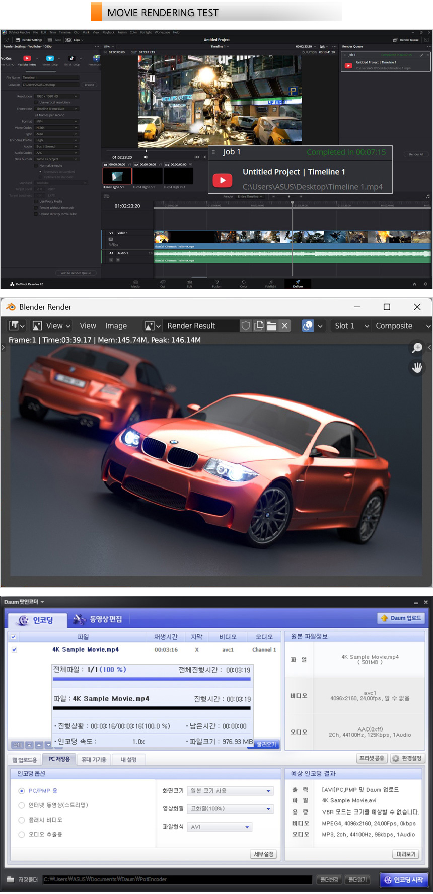 영상편집 S/W 다빈치 리졸브를 이용해 랜더링 테스트를 진행하고 있는 모습으로 (640MB, 920MB, 990MB 4K 동영상을 단일 동영상으로 랜더링, FHD 해상도에 H.264 비디오 코덱) 07분 15초가 소요되는 것을 확인할 수 있었다. 또한 블랜더 랜더링 테스트는 3분 39초가 소요되었으며 다음 팟인코더를 이용해 4K 동영상의 인코딩을 진행했는데 3분 19초의 인코딩 시간을 보여주었다.