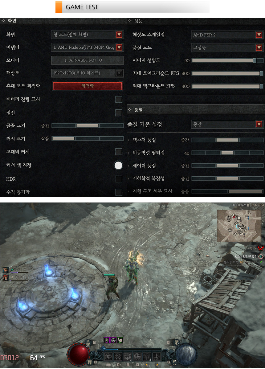 디아블로 4를 WUXGA 해상도, 중간 옵션에서 플레이 하고 있는 모습으로 FSR2를 적용했을 때 50-72 프레임을 보여주어 부드럽게 게임을 즐길 수 있었다.