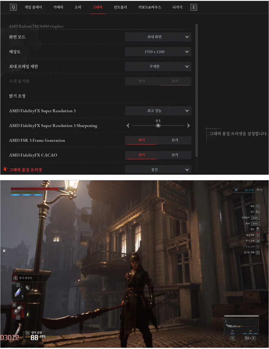 P의 거짓을 WUXGA 해상도, 중간옵션에서 플레이 하고 있는 모습으로 FSR3 적용후 프레임 생성을 활성화 하면 65-86 프레임을 보여주어 부드럽게 플레이 할 수 있었다.