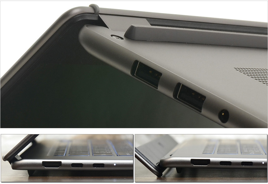 상판을 들어 올리면 자연스럽게 하판이 들리며 키보드에 경사가 생긴다. 좀더 쾌적한 타이핑이 가능하며 바닥면에 여유공간이 생겨 스피커 부밍 현상을 최소화 할 뿐만 아니라 차가운 공기가 원활하게 내부로 유입된다. 이를 통해 안정성을 높일 수 있다.