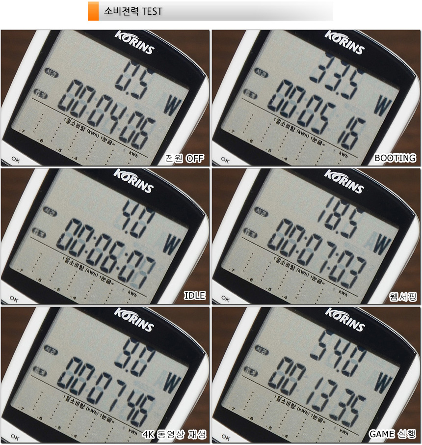 소비전력 테스트를 진행하고 있는 모습으로 (최고 성능 모드) 캐주얼한 작업에서는 20W 내외의 낮은 소비전력으로 작동했으며 게임 실행시에는 54W 까지 소비전력이 올라가는 것을 확인할 수 있다. (소비전력이 떨어지지 않고 40W 후반~50W 초반을 꾸준히 유지해 주었다.)