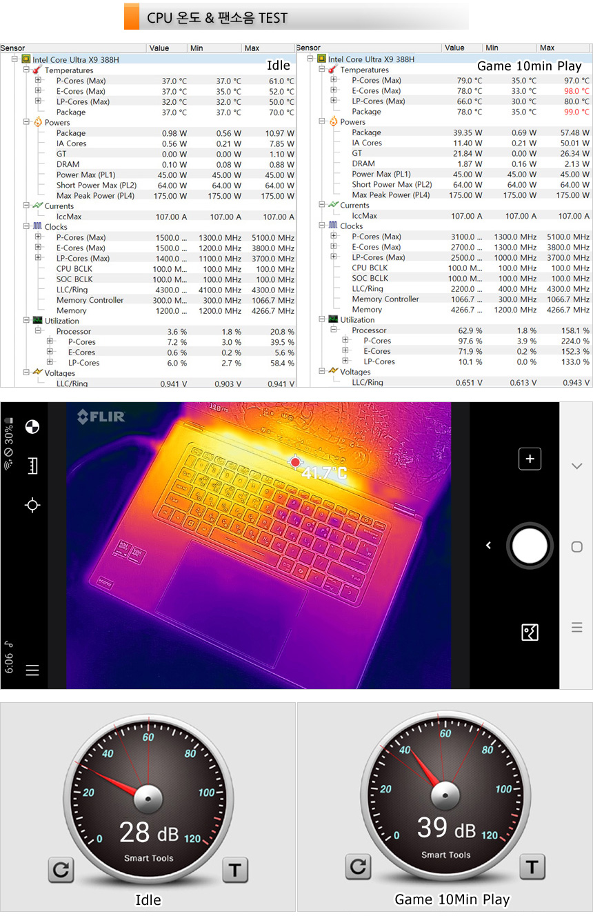 또한 열화상 카메라를 이용해 게임 실행중 노트북 표면의 열분포를 확인해 보았는데 통풍구 부분에 열이 집중되는 것을 확인할 수 있었다. 팜래스트 온도는 낮아 손을 올려두고 게임이나 작업을 했을 때 열로 인한 스트레스는 없었다.