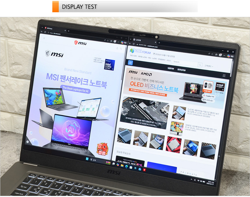 4K 동영상을 이용해 멀티미디어 테스트를 진행하고 있는 모습으로 16형 대화면에 QHD+ 해상도의 OLED 패널을 탑재해 선명한 영상을 즐길 수 있었으며 (진한 블랙 표현이 특히 마음에 들었다.) 사운드 퀄리티도 뛰어나 높은 몰입감을 경험할 수 있었다. 또한 MP3 파일을 이용해 스피커 사운드 테스트를 진행했는데 4개의 유닛을 지원하는 모델답게 게이밍 노트북 못지 않은 높은 출력은 물론 밀도감 높은 단단한 사운드를 들려주어 귀가 아주 즐거웠다.