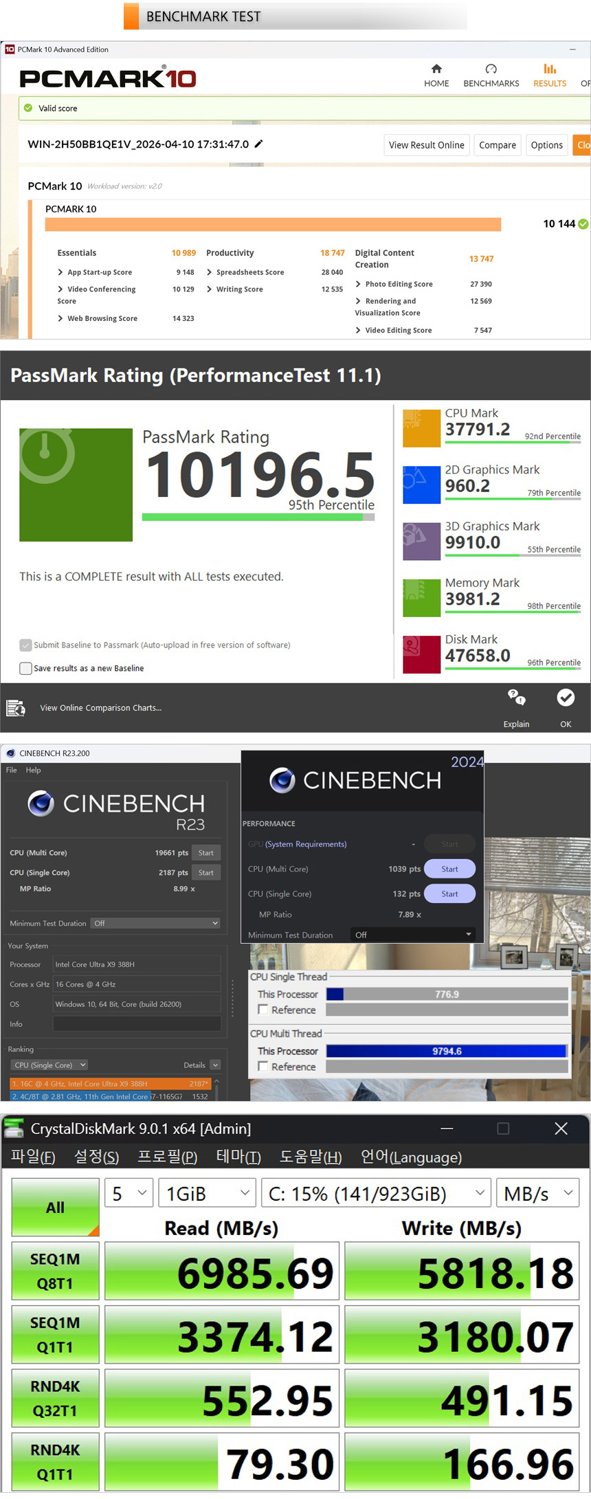 강력한 성능을 지원해 다용도로 노트북을 활용할 수 있는 것은 이 제품의 가장 큰 장점이라 할 수 있다. 인텔 아크 B390를 지원하는 팬서레이크 388H 프로세서를 장착해 고성능을 필요로 하는 작업을 부드럽게 실행할 수 있으며 CPU는 물론 GPU 성능도 중요한 영상편집 랜더링 시간도 상당히 빠른 것을 확인할 수 있었다.