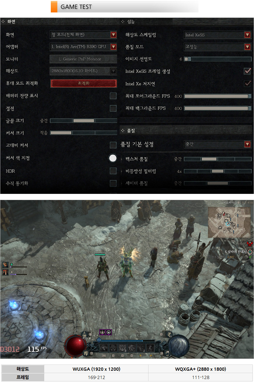 디아블로 4를 실행한 모습으로 WQXGA+ 해상도에서도 100 프레임 이상으로 플레이가 가능했다. XeSS 프레임 생성이 가능해 구형 게이밍 노트북 수준의 성능으로 게임을 즐길 수 있을 것이다.