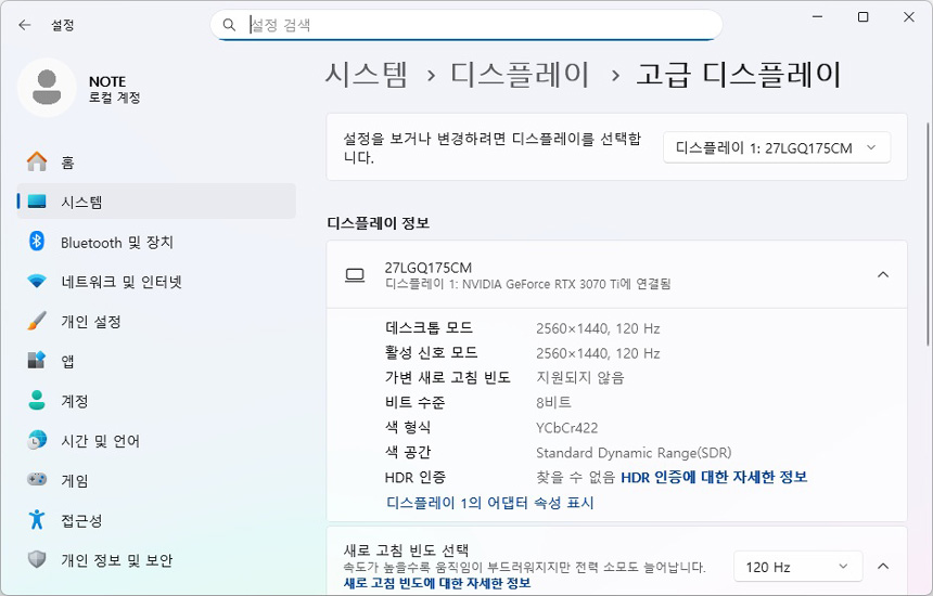 테스트를 위해 책상에 PC와 모니터를 설치한 모습으로 4면 슬림베젤을 적용한 27형 모니터 답게 공간을 많이 차지하지 않았다. 집이나 사무실 등의 책상이 협소하더라도 사용에 큰 어려움은 없을 것이다. 또한 HDR 기술을 지원하는 모니터 답게 윈도우 에서도 HDR 설정이 가능한 것을 확인할 수 있다.