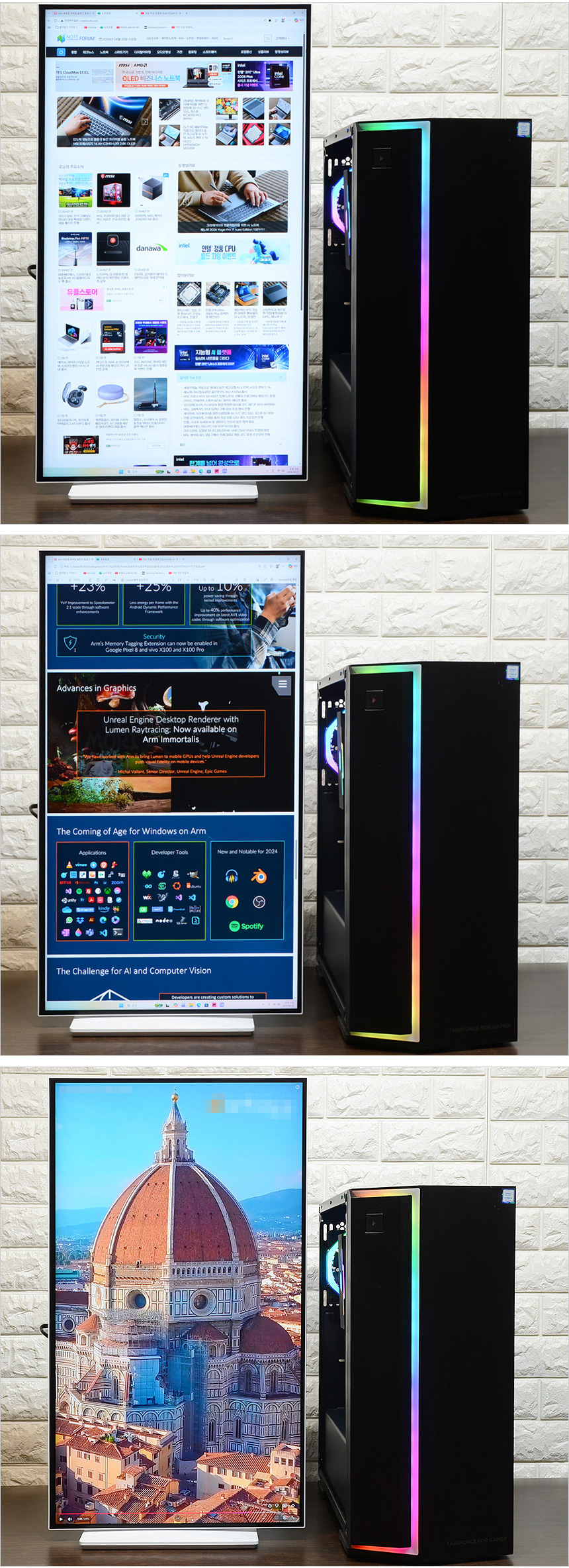 멀티스탠드를 지원하는 것도 칭찬하고 싶다. 스마트폰 등에 특화된 세로영상을 꽉찬 화면으로 즐길 수 있으며 문서작업이나 웹서핑이 상당히 편했다. 또한 높낮이 조절과 회전도 가능해 사용자에 맞게 모니터 위치를 조정할 수 있었다.