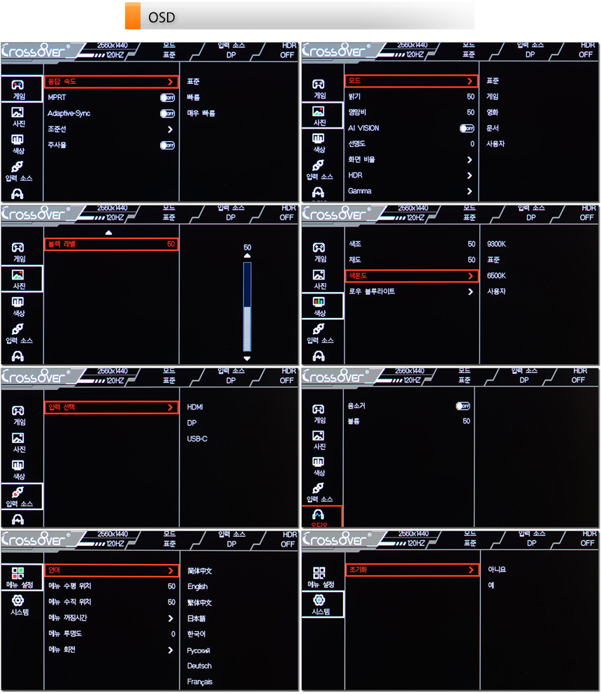 OSD 버튼에서 핫키를 지원해 볼륨과 조준선, 입력소스 등 자주 사용하는 기능을 빠르게 설정할 수 있다. 메인메뉴 에서는 밝기나 명암 설정이 가능하며 게임관련 기능과 색상, 사운드 설정등을 지원한다.
