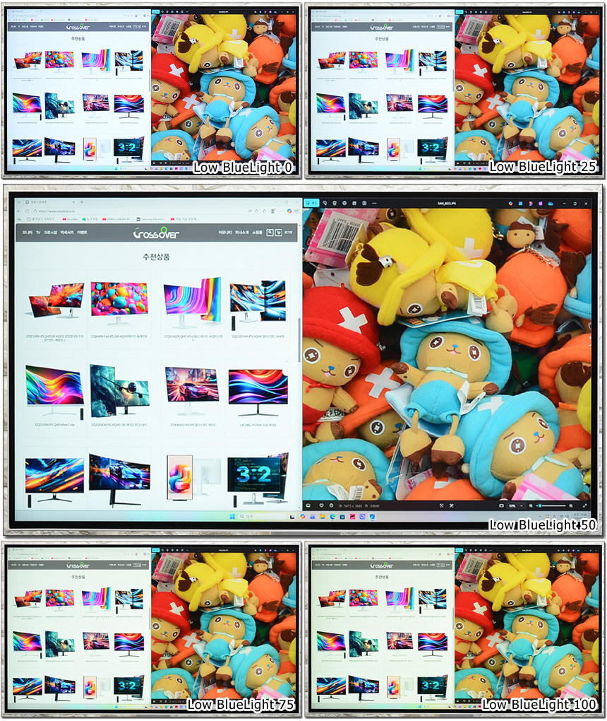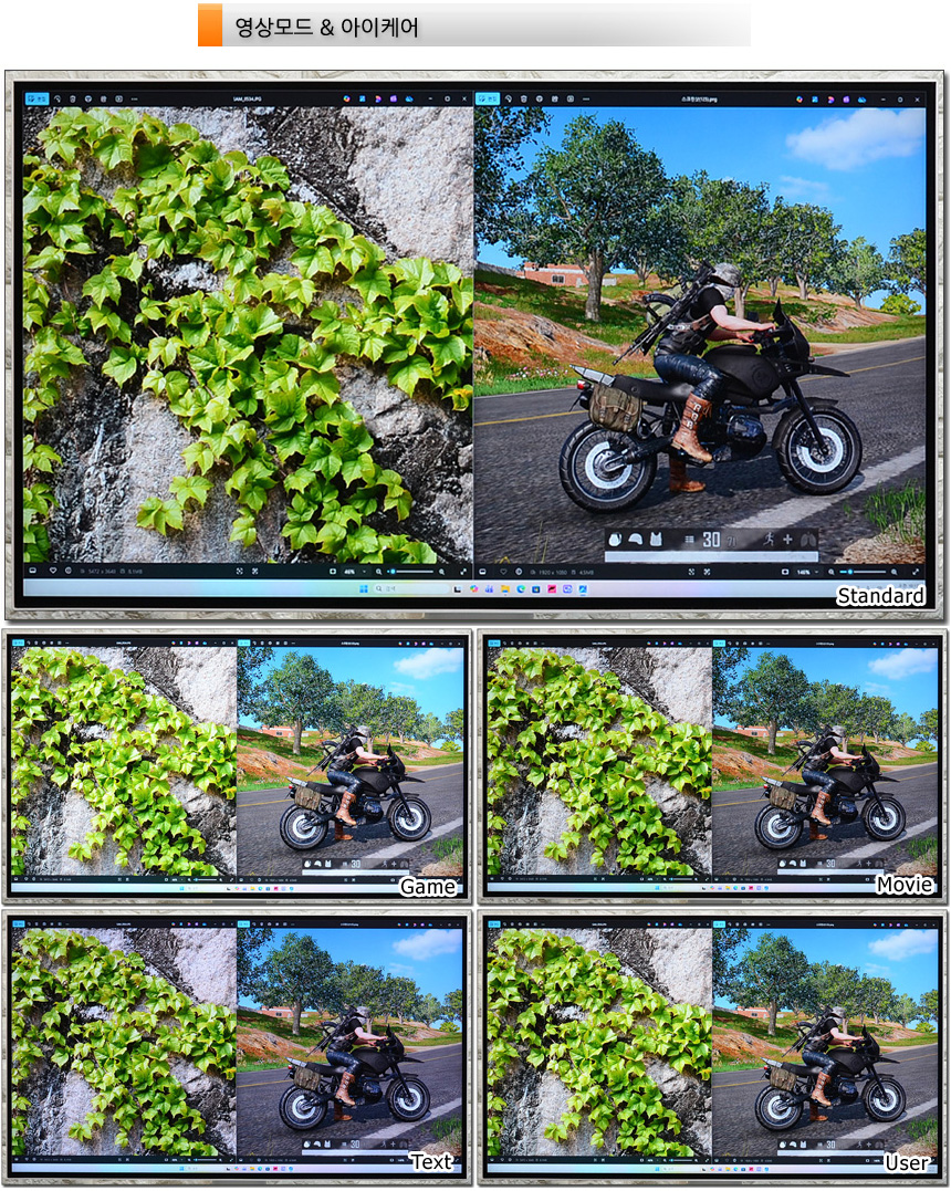 화면모드를 비교한 모습으로 밝기와 명암비에서 차이가 확연한 것을 확인할 수 있었다. 평소에서는 일반 모드를 사용하다가 (밝기 50%) 작업이나 게임을 할 경우 그에 맞는 모드로 변경해 최상의 영상을 즐기기 바란다.