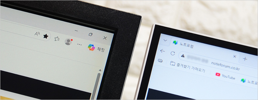 두 대의 모니터를 셋팅한 김에 베젤 두께를 비교해 보았는데 슬림베젤이 적용된 모니터 답게 두께 차이가 상당했다. (베젤이 얇으면 듀얼모니터 설정시 이질감을 최소화 할 수 있으며 높은 몰입감을 선사한다.)