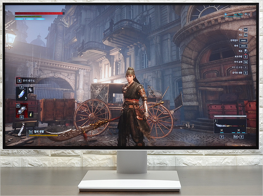 어두운 배경이 주를 이루는 디아블로 4와 P의 거짓을 플레이 하고 있는 모습으로 높은 밝기를 지원해 명확하게 캐릭터와 배경을 구분할 수 있었으며 지싱크 호환기술 지원으로 화면 찟어짐 등의 불편없이 게임에 몰입할 수 있었다. (블랙레벨 등을 사용하면 시인성을 더 높일 수 있다.)