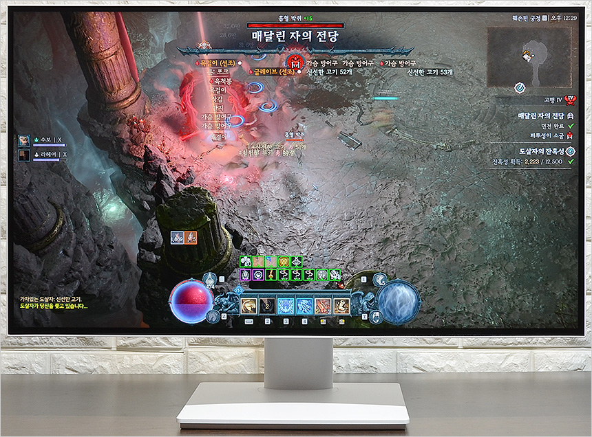 10억 7천만 컬러의 나노 IPS 블랙 패널 탑재 모니터 답게 진하고 선명한 컬러 표현이 인상적이었으며 4면 슬림 베젤을 적용해 눈에 꽉 들어찬 몰입감 높은 영상을 즐길 수 있었다. (게이밍 전용 모니터와 비교하면 스펙이 약간 떨어지지만 캐주얼하게 게임을 즐기는 필자는 전혀 부족함이 느껴지지 않았다.)