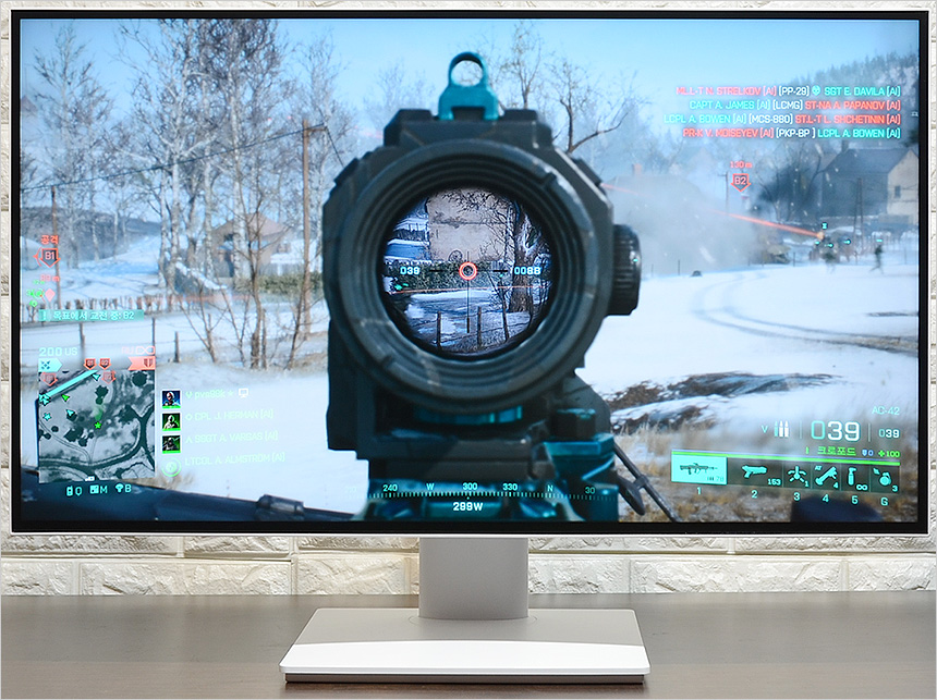 FPS 게임 오버워치2와 배틀필드 2042를 플레이 하고 있는 모습으로 120Hz 주사율 지원으로 60Hz 일반 모니터와는 부드러움에서 분명한 차이를 경험할 수 있었다. 또한 조준선을 지원해 사격 정확성을 높일 수 있었으며 빠른 응답속도 지원으로 잔상으로 인한 스트레스도 없었다.