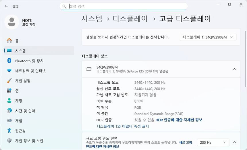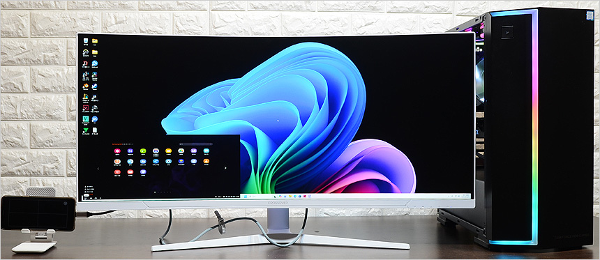 테스트를 위해 PC와 모니터를 셋팅한 모습으로 대화면 울트라와이드 모니터 답게 많은 공간을 차지했다. 이 제품은 일반 모니터 대비 좌우폭이 무척 넓기 때문에 모니터 설치전 반드시 여유 공간을 확보해야 한다. (듀얼 모니터를 사용한다고 생각하면 된다.) 2개의 DP 와 HDM 단자를 지원해 PC뿐만 아니라 게임콘솔이나 OTT 플레이어등 다양한 디바이스 연결이 가능하며 HDR 기술이 적용된 모델답게 디스플레이 메뉴에서 HDR 설정이 가능한 것을 확인할 수 있다.