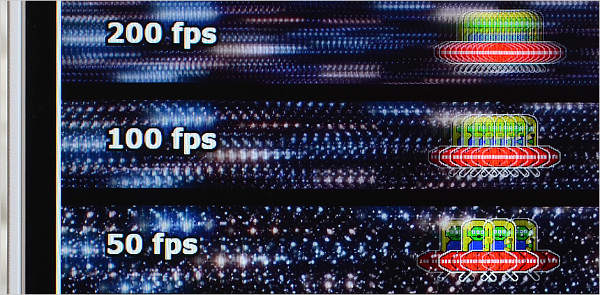 상단의 사진은 200Hz 의 높은 주사율을 쉽게 확인할 수 있도록 하위 프레임과 같이 재생되는 영상 (960 Pixel Per Sec) 을 셔터스피드 1/20 로 촬영한 모습으로 프레임이 낮을수록 캐릭터의 수가 적으며 프레임이 높아질수록 시간당 많은 화면이 뿌려지기 때문에 캐릭터의 수가 많은 것을 확인할 수 있다. 직접 눈으로 영상을 볼 경우 200Hz가 더 자연스럽게 움직인다. @ 참고로 HDMI 연결시 100Hz 주사율을 지원한다. PC에 사용시 DP 단자를 사용하기 바란다.