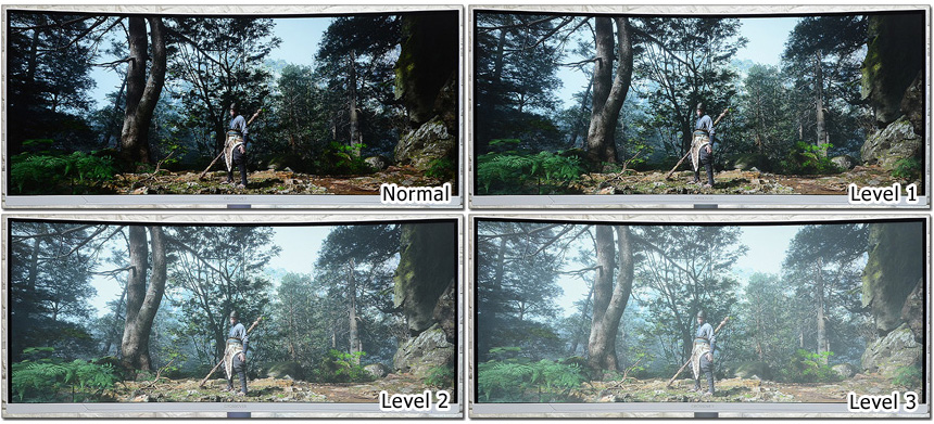 어두운 곳에 숨어있는 적을 쉽게 발견할 수 있도록 하는 블랙레벨을 지원한다. 상단의 사진은 비교 테스트를 진행하고 있는 모습으로 값이 높아질수록 시인성이 개선되는 것을 확인할 수 있었다. (레벨이 올라갈수록 선명도는 떨어진다. 이점을 고려해 사용하기 바란다.)