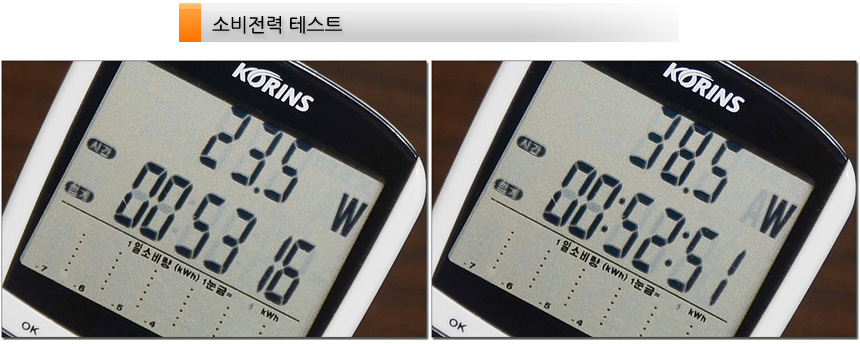 소비전력 테스트를 진행하고 있는 모습으로 100% 밝기에서 38.5W 소비전력을 보여주었으며 50% 밝기에서는 23.5W로 소비전력이 줄어드는 것을 확인할 수 있었다. (대기에서는 0.5W를 유지한다.) 전기세 각정없이 사용할 수 있을 것이다. (일반적인 상황에서는 50% 밝기만으로 충분했다.)